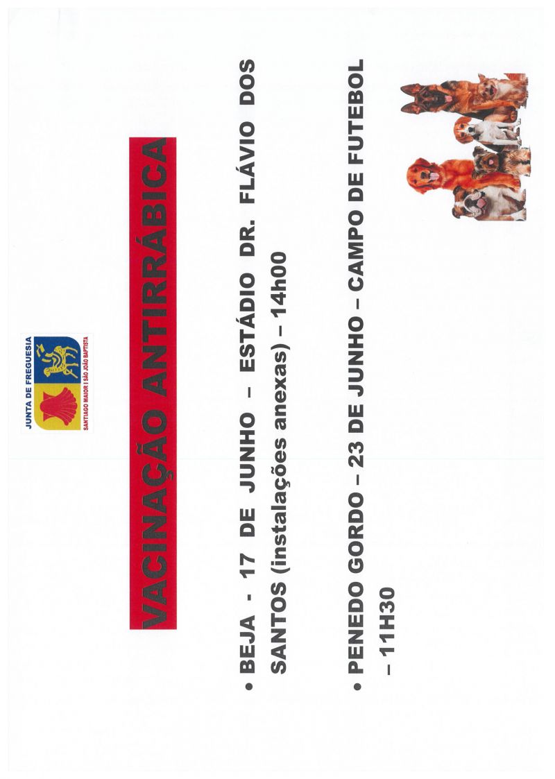 A campanha de vacinação antirrábica irá decorrer no dia 17 de junho de 2025 pelas 14h00 no Estádio Dr. Flávio dos Santos (instalações anexas) e no dia 23 de Junho de 2025 no Penedo Gordo, no Campo de Futebol, pelas 11h30.