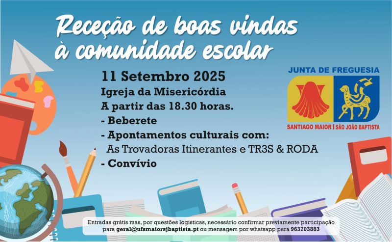 A Junta de Freguesia tem, assim, a honra de convidar docentes, educadores, auxiliares, representantes dos pais/encarregados de educação dos Centros escolares de Santiago Maior, Penedo Gordo e São João Baptista, bem como as respetivas direções dos Agrupamentos, a participar neste encontro de boas vindas, que marca o início de um novo ciclo educativo.