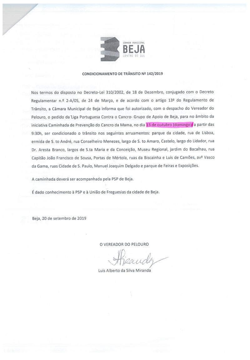 A pedido da Liga Portuguesa Contra o Cancro - Grupo de Apoio de Beja, no âmbito da iniciativa Caminhada de Prevenção do Cancro da Mama, no dia 13 de outubro de 2019, a partir das 09h30, o trânsito irá estar condicionado em várias ruas desta União de Freguesias.