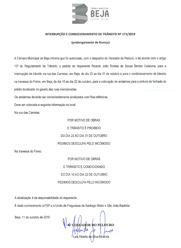 Interrupção de trânsito na Rua das Carretas do dia 23 ao dia 31 de outubro e na Travessa do Forno do dia 16 ao dia 22 de outubro.