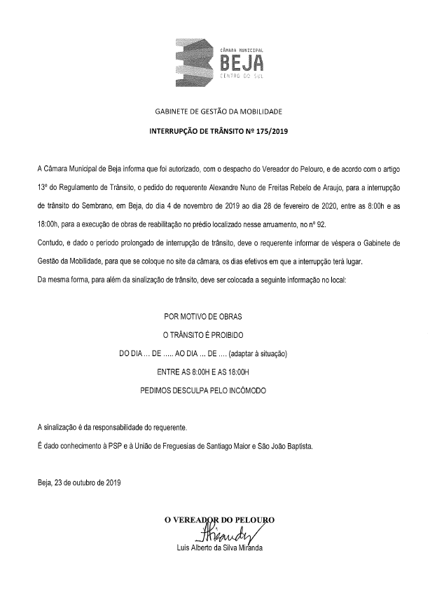 Interrupção de trânsito no Sembrano do dia 04 de novembro de 2019 ao dia 28 de fevereiro de 2020.