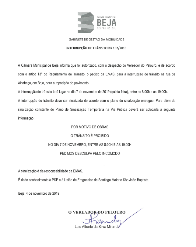 Interrupção de trânsito na Rua de Alcobaça no dia 07 de novembro de 2019 entre as 08h00 e as 19h00