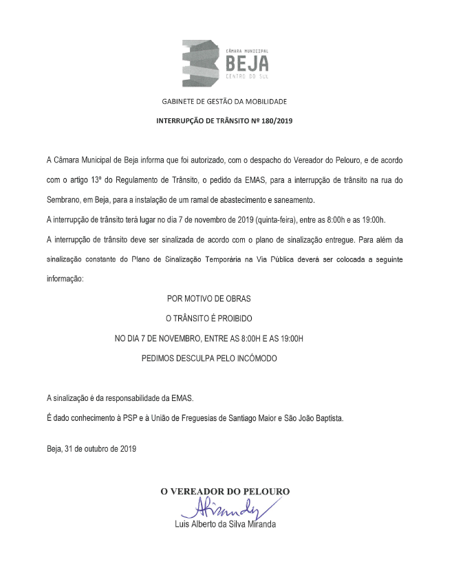 Interrupção de trânsito na rua do Sembrano no dia 07 de novembro de 2019 entre as 08h00 e as 19h00