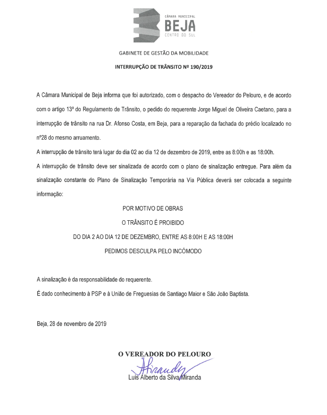 Interrupção de trânsito na Rua Dr. Afonso Costa do dia 02 ao dia 12 de dezembro, entre as 08h00 e as 18h00.