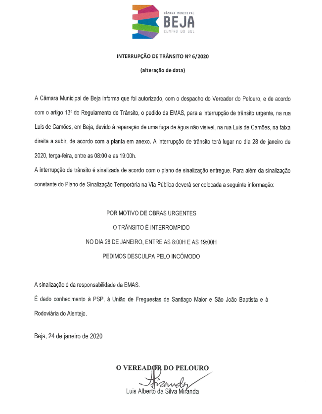 Por motivos de obras urgentes, o trânsito é interrompido no dia 28 de janeiro de 2020 entre as 08h00 e as 19h00