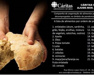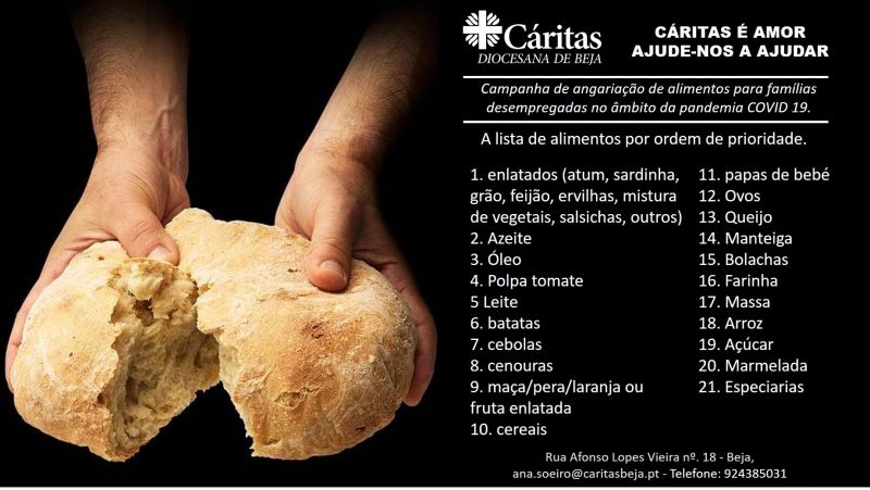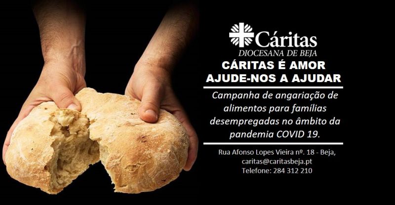 A Cáritas Diocesana de Beja decidiu avançar com uma campanha de recolha de alimentos, denominada "Cáritas é Amor, Ajude-nos a Ajudar" que tem como objetivo poder angariar e distribuir alimentos pelos mais carenciados afetados pelo desemprego no âmbito da pandemia originada pelo COVID 19.