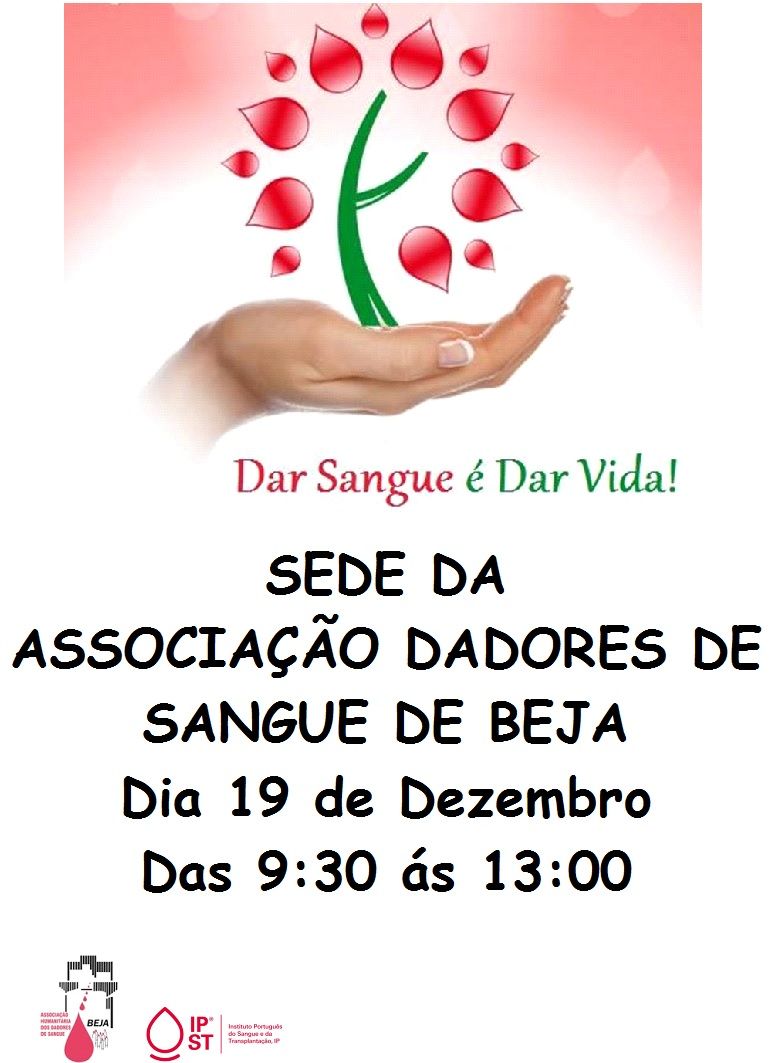 Dia 19 de dezembro, entre as 09:30 e as 13:00 na sede da Associação Dadores de Sangue de Beja