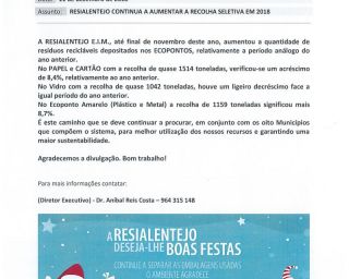 RESIALENTEJO CONTINUA A AUMENTAR A RECOLHA SELETIVA EM 2018