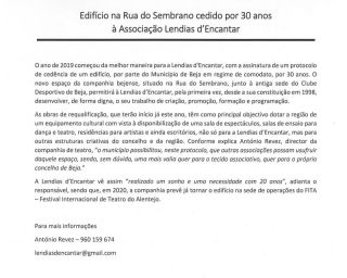Nota de Imprensa - Edifício na Rua do Sembrano cedido por 30 anos à Associação Lendias d`Encantar