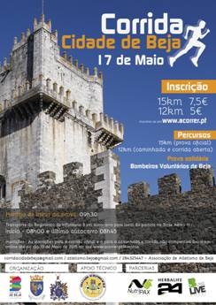 Inserida nas comemorações do Dia da Cidade, vai ter lugar, no próximo dia 17 de Maio, pelas 9.30 horas, a Corrida da Cidade, com organização da Câmara Municipal de Beja, em parceria com Base Área 11 e o Regimento de Infantaria 3, e com colaboração, supervisão técnica e arbitragem da Associação de Atletismo de Beja. Esta iniciativa tem também um cariz solidário, sendo que parte das receitas das inscrições reverterá a favor dos Bombeiros Voluntários de Beja.