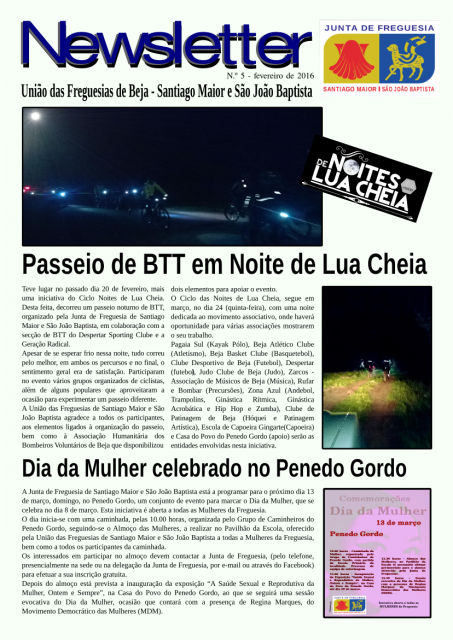 Já saiu a Newsletter referente ao mês de fevereiro, da União das Freguesias de Santiago Maior e São João Baptista. Em destaque está o Passeio Noturno de BTT, iniciativa incluída no Ciclo Noites de Lua Cheia.