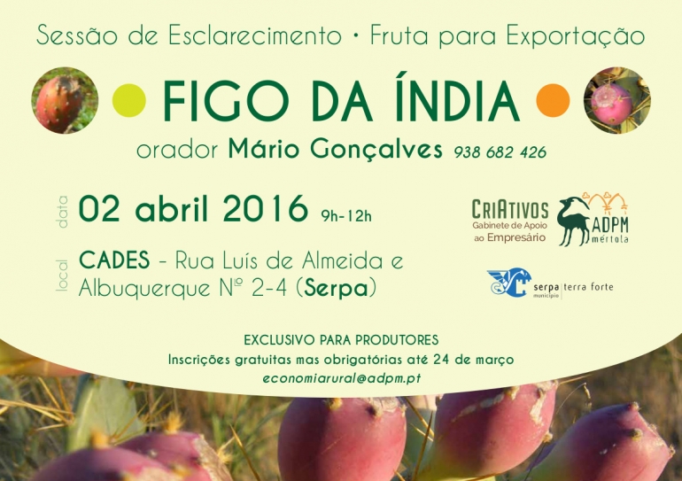 Albuquerque Nº 2-4), em Serpa, no com o título “Fruta para Exportação – Figo da Índia”. Destina-se a produtores e é de inscrição gratuíta.