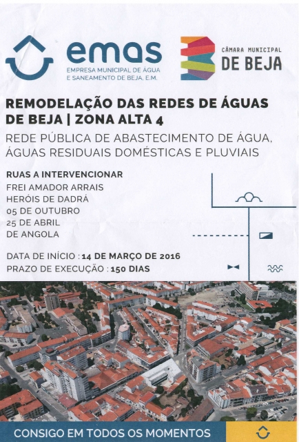 Desde o passado dia 14 e março que a EMAS está a proceder à remodelação das Redes de Águas de Beja. A intervenção ao nível da rede pública de abastecimento de água, águas residuais domésticas e pluviais está a ser realizada nas Rua Frei Amador Arrais, Heróis Dadrá, 5 de Outubro, 25 de Abril e Rua de Angola.