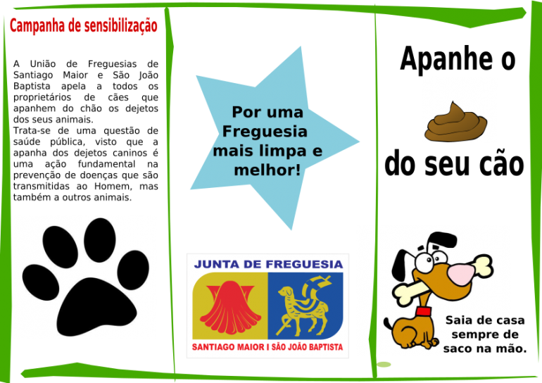 É cada vez maior o número de pessoas que se veem a passear os seus cães, com um saco na mão para apanhar os dejeto, mas persistem muitas situações em que isso não acontece. A Junta de Freguesia de Santiago Maior e São João Baptista apela a todos os proprietários de cães que saiam de casa com os mesmos, sempre de saco na mão.