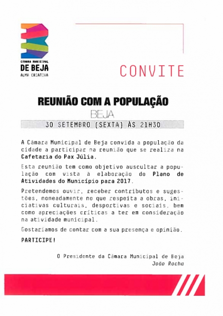 Vai decorrer na próxima sexta-feira, dia 30 de setembro de 2016, pelas 21.30 horas, na cafetaria do Pax Júlia, uma reunião, promovida pela Câmara Municipal de Beja, para auscultar a população com vista à elaboração do Plano de Actividades do Município para 2017.