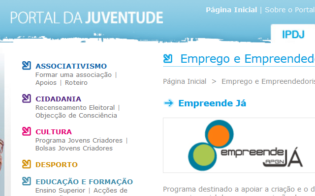 O programa “Empreende Já”, promovido pelo Instituto Português do Desporto e Juventude (IPDJ, IP), tem como objetivos apoiar a criação e o desenvolvimento de empresas e de entidades da economia social, bem como a criação de postos de trabalho, por e para jovens. É uma medida integrada no Plano Nacional de Implementação de uma Garantia para a Juventude, confinanciado pelo POISE- Programa Operacional Inclusão Social e visa ser um apoio à empregabilidade de jovens que não trabalham, não estudam e não se encontram em formação, entre os 18 e os 29 anos.
