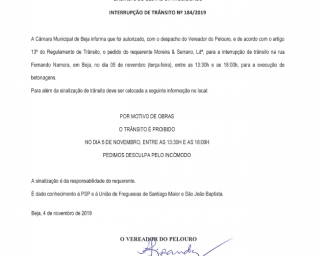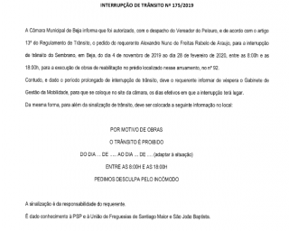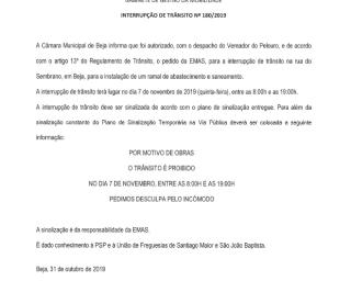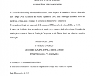 Interrupção de trânsito no dia 30 de outubro de 2019, entre as 08h00 e as 19h00, na Rua do Sembrano.