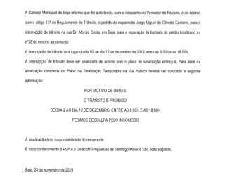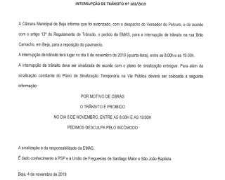 Interrupção de trânsito na rua Dr. Brito Camacho no dia 06 de novembro de 2019, entre as 08h00 e as 19h00