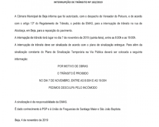 Interrupção de trânsito na Rua de Alcobaça no dia 07 de novembro de 2019 entre as 08h00 e as 19h00