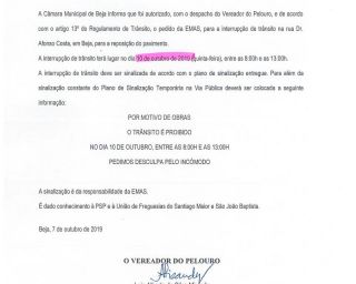 Interrupção de trânsito na Rua Dr. Afonso Costa, no dia 10 de outubro de 2019, entre as 08h00 e as 13h00.