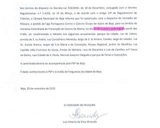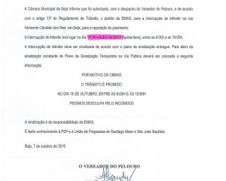 A pedido da Liga Portuguesa Contra o Cancro - Grupo de Apoio de Beja, no âmbito da iniciativa Caminhada de Prevenção do Cancro da Mama, no dia 13 de outubro de 2019, a partir das 09h30, o trânsito irá estar condicionado em...