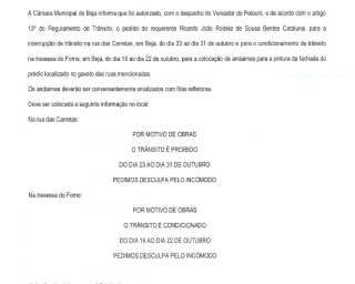 Interrupção de trânsito na Rua das Carretas do dia 23 ao dia 31 de outubro e na Travessa do Forno do dia 16 ao dia 22 de outubro.