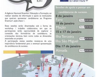 Exmos.(as) Srs.(as) A Agência Nacional Erasmus+ Educação e Formação está a organizar os Workshops de Apoio e informação às instituições que queiram apresentar candidaturas ao Programa Erasmus+, ação-chave 1. Estas sessões serão dinamizadas sob a forma de workshop / trabalho colaborativo, em...