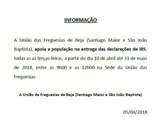 A União das Freguesias de Beja (Santiago Maior e São João Baptista), apoia os seus Munícipes na entrega das declarações de IRS, todas as terças-feiras em Beja na Sede da União de Freguesias e no Penedo Gordo às quartas-feiras na Delegação da...