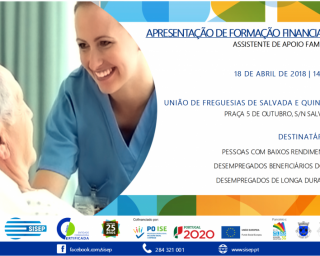 No dia 18 de abril de 2018 pelas 14h30, na Junta de Freguesia da Salvada, irá decorrer uma sessão de apresentação de formação financiada - Assistência à família para beneficiários de RSI e Desempregados de longa duração.
