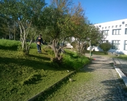Trabalhadores da União das Freguesias de Santiago Maior e São João Baptista procedem ao corte e limpeza do coberto vegetal, no recinto da Escola Básica 2, 3 de Santiago Maior, durante a interrupção letiva da Páscoa.