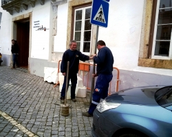 Equipa de trabalhadores da Junta de Freguesia de Santiago Maior e São João Baptista recolocam e reforçam sinalização de trânsito.